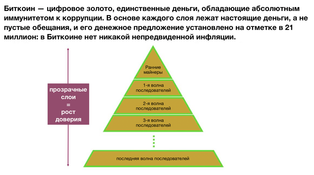 Эта пирамида “цифрового золота”, в основании которой лежат неизменные слои, затмевает фиатные валюты с присущей им неопределенностью. Поскольку деньги являются “страховкой от неопределенности”, спрос на них основывается на относительной определенности их денежных свойств; и Биткоин оптимизирует все пять основных свойств денег: он демонстрирует делимость, долговечность, портативность, обладает узнаваемостью чистой информации и дефицитностью времени. Как смерть и налоги, определенность ограничения в “21 миллион биткоинов” — это концепция, которую невозможно опровергнуть. Сочетаясь со стимулом к опережающему будущему принятию этих цифровых, абсолютно дефицитных и защищенных от кражи денег, это наделяет Биткоин теоретико-игровой гравитацией, от которой рынок денег просто не может убежать. Парадоксальным образом, именно эта неизбежность ведет к освобождению все большего числа фиатных рабов по всему миру.