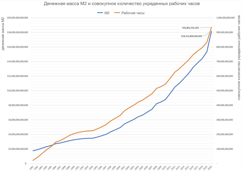 Объем денежной массы M2 США (синяя линия) и общее количество украденных рабочих часов (красная линия). “Печатание денег” — это подделка валюты и кража человеческого времени — другими словами, это форма рабства.