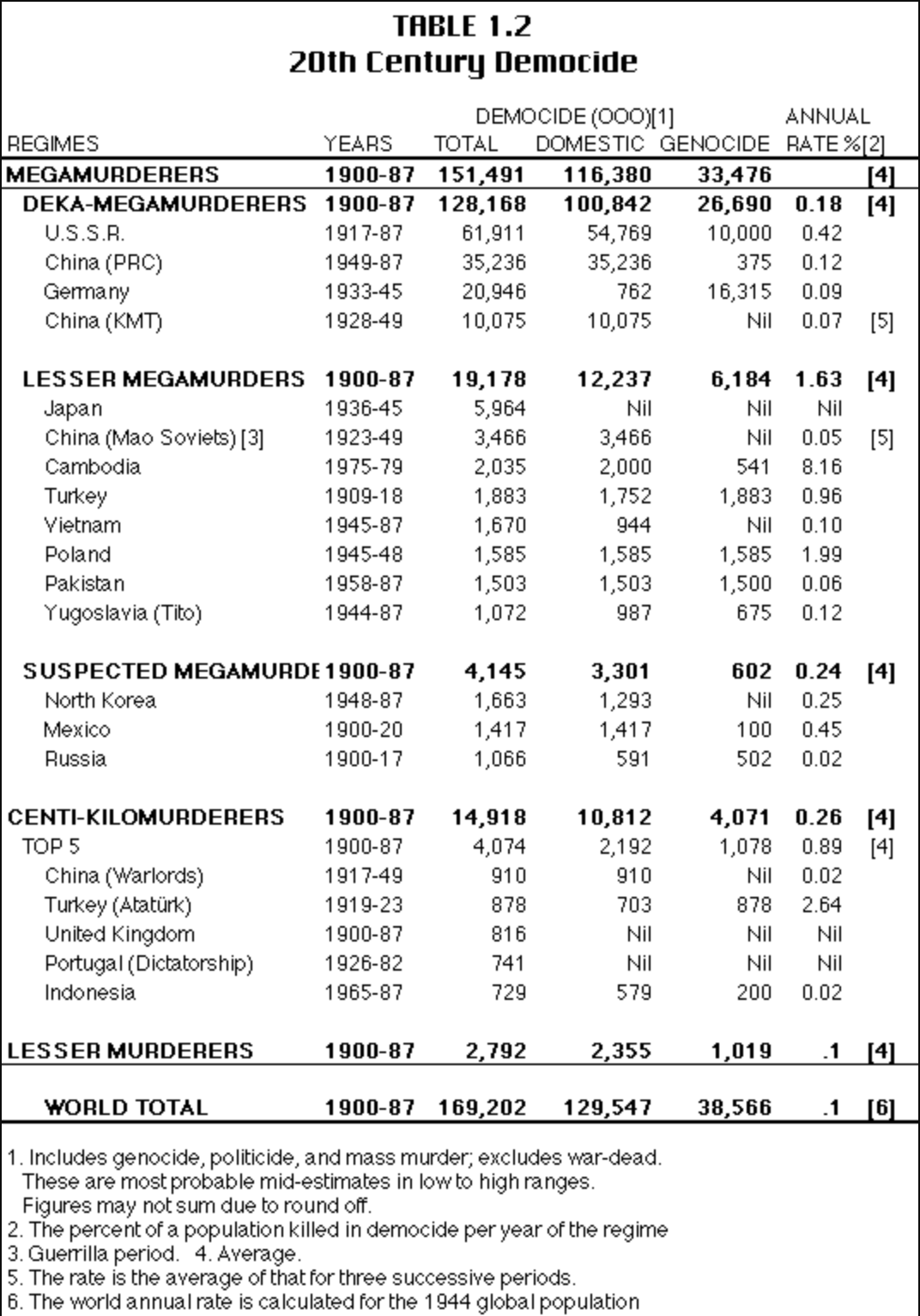В таблице приведена количественная оценка (в млн) убийств, совершенных правительствами в 1900–1987 гг.: 169 202 000 жертв демоцида.