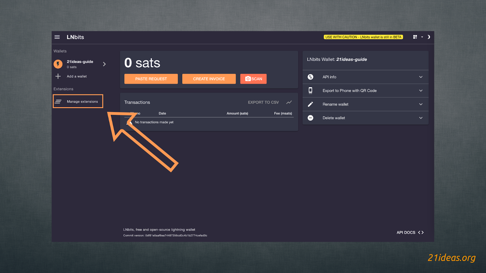 Чтобы открыть “магазин расширений” LNbits нужно нажать на кнопку Manage Extensions, расположенную в левой части экрана ниже вкладки вашего кошелька(ов):