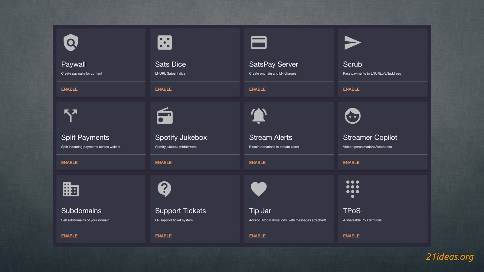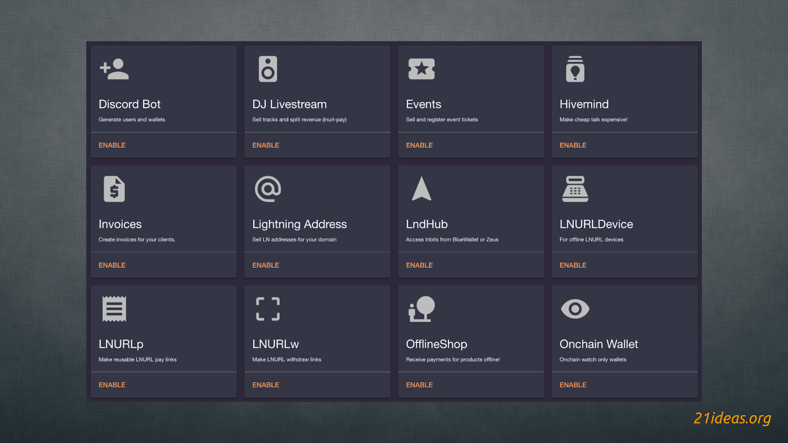 LNbits включает десятки расширений, созданных лайтнинг- и биткоин-энтузиастами. Они позволяют запускать краны, пейволлы, точки оффлайн-продаж (торговые терминалы), ссылки на оплату товаров и услуг, сбор оплаты за билеты на мероприятия, игры в кости, оплату услуг, предоставляемых вашим сервером, платный музыкальный автомат и многое, многое другое.