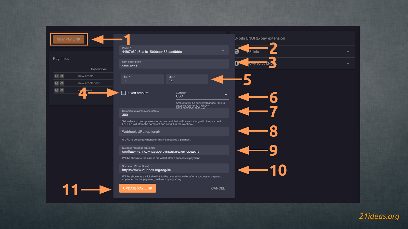 Заполнив все желаемые поля (обязательными являются только 1,2 и 5), нажимаем CREATE PAY LINK (11)