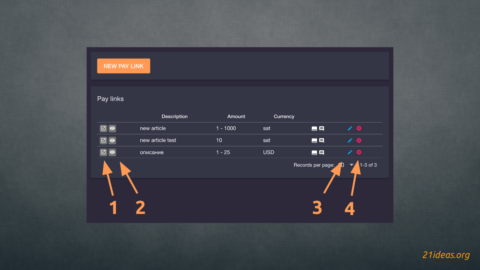 В первую очередь для создания нового QR-кода нужно нажать NEW PAY LINK (1). Перед вами появится всплывающее окно, где вы сможете: