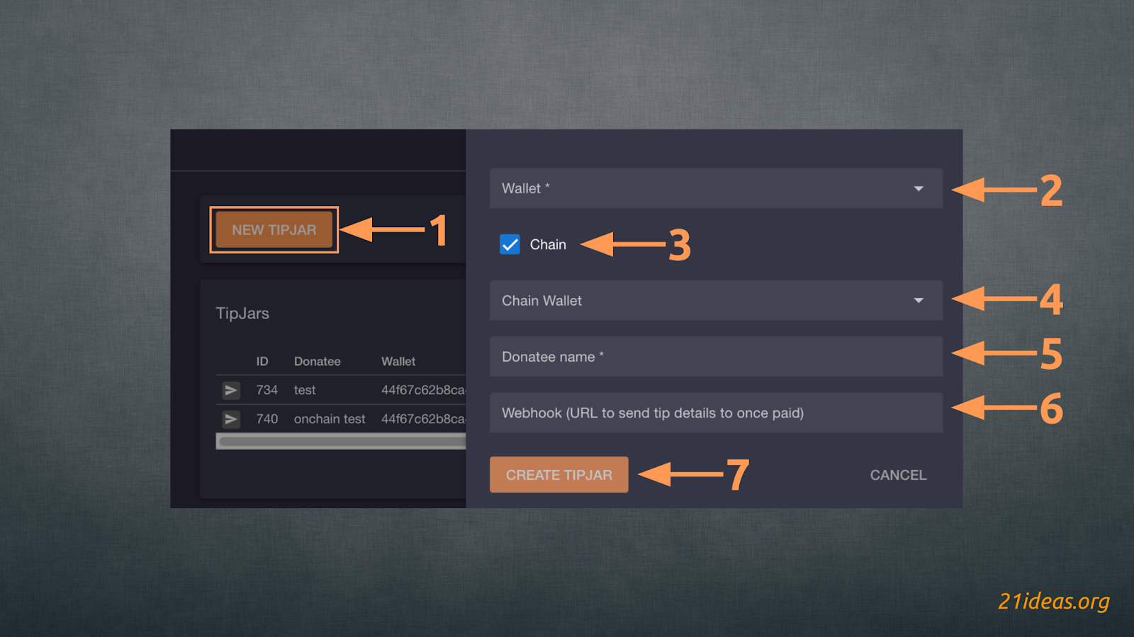 Для настройки этого расширения опять же нажимаем NEW TIPJAR (1) и выбираем желаемый Лайтнинг-кошелек (2). Если вы уже импортировали ончейн-кошелек, будет доступен пункт #3 – вы сможете поставить галочку в этом поле и выбрать тот ончейн-кошелек, который будет получать средства при отправке на цепочке (4). Далее нужно выбрать имя получателя, которое будет отображаться для отправителя при переходе по ссылке (5). Опять же есть возможность добавления веб-хука для настройки оповещений о получении средств (6). Готово, нажимаем CREATE TIPJAR (7).