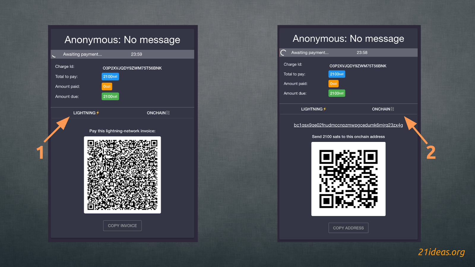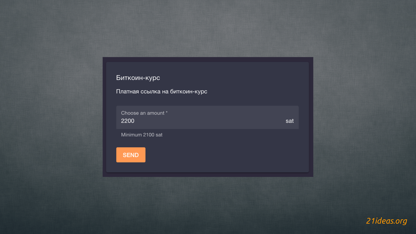 Обратите внимание, как я (притворившись отправителем) указал сумму в 2200 сат при минимуме в 2100. Минимальная сумма оплаты автоматически высвечивается для отправителя: