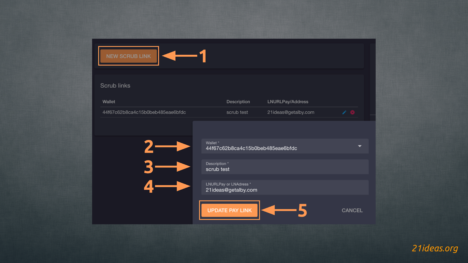 Выбираем кошелек (2), добавляем описание скраба (3) и указываем LNURL кошелька-получателя или Lightning-адрес (4). Подробнее о Lightning-адресах можно узнать в этой статье. Если у вас запущен собственный Лайтнинг-узел, вы можете присоединить к нему, например, приложение Alby и таким образом автоматически отправлять сатошики на собственный узел и храня их некастодиальным образом. Для менее технически подкованных пользователей неплохой и удобной практикой будет создание нового кошелька в расширении Alby для вашего браузера и указание полученного вами адреса. В моем случае это 21ideas@getalby.com. Готово, нажимаем CREATE PAY LINK (5) и скраб готов.