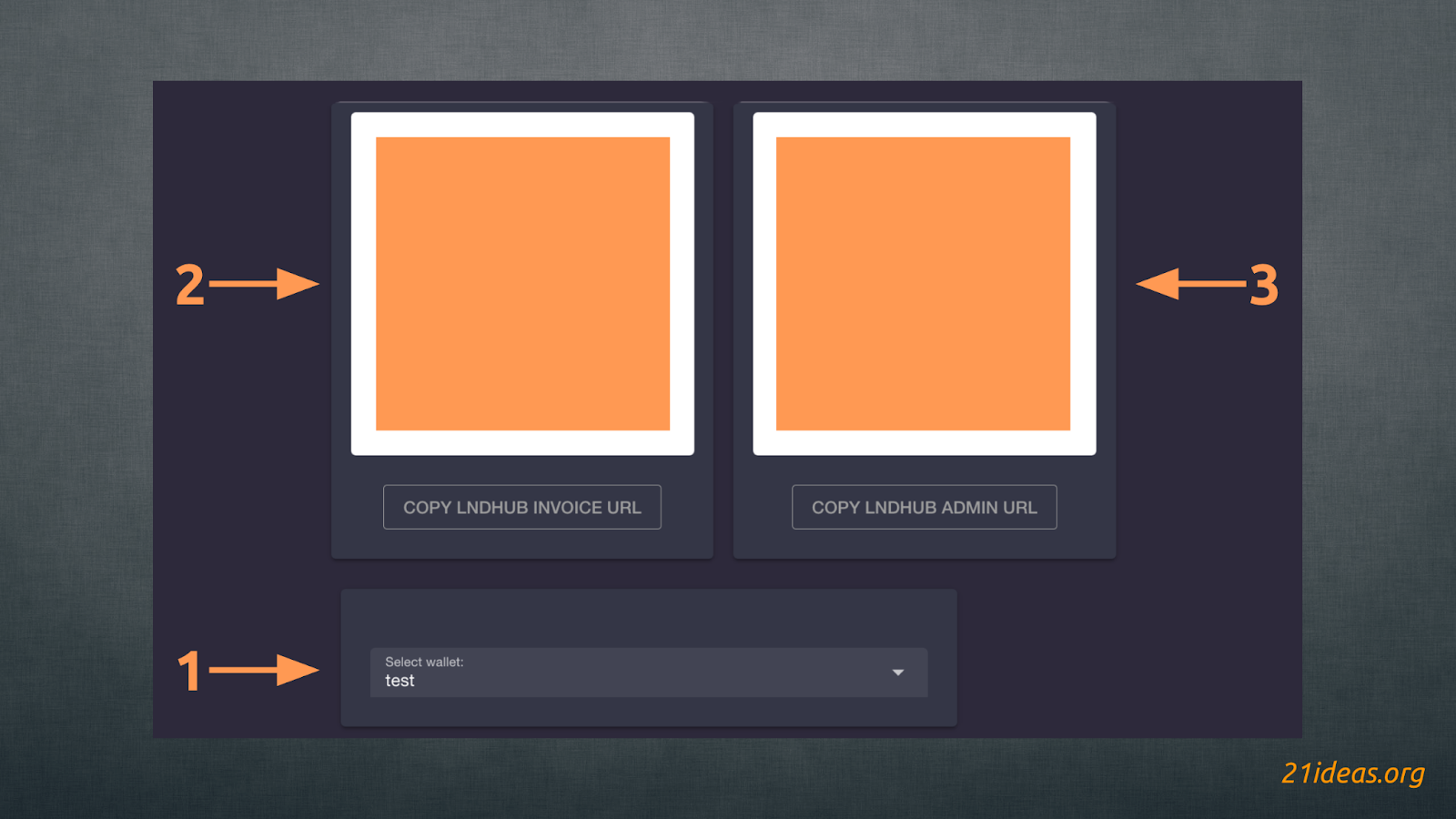 В первую очередь выберите кошелек, доступ к которому вы хотите предоставить своему мобильному приложению Blue Wallet (1). Далее, сканируя QR-код (я закрыл их из соображений безопасности собственных средств) слева (2) вы предоставляете кошельку Blue Wallet права пользователя, то есть благодаря этому кошельку можно будет генерировать инвойсы, но не тратить средства. Код справа (3) предоставляет права администратора и возможность тратить средства с кошелька LNbits.