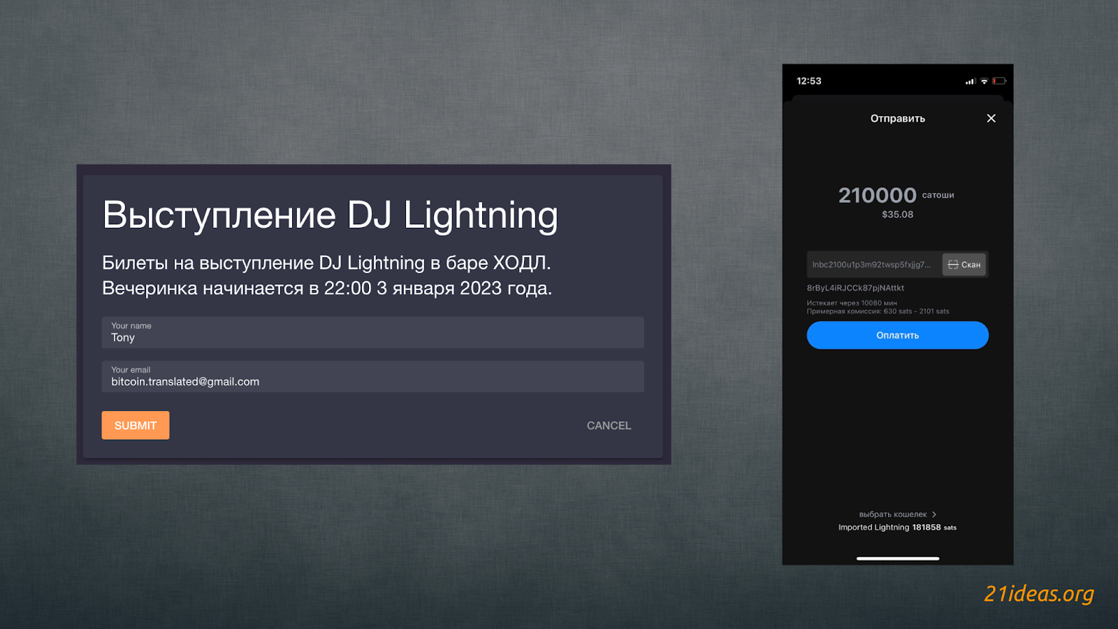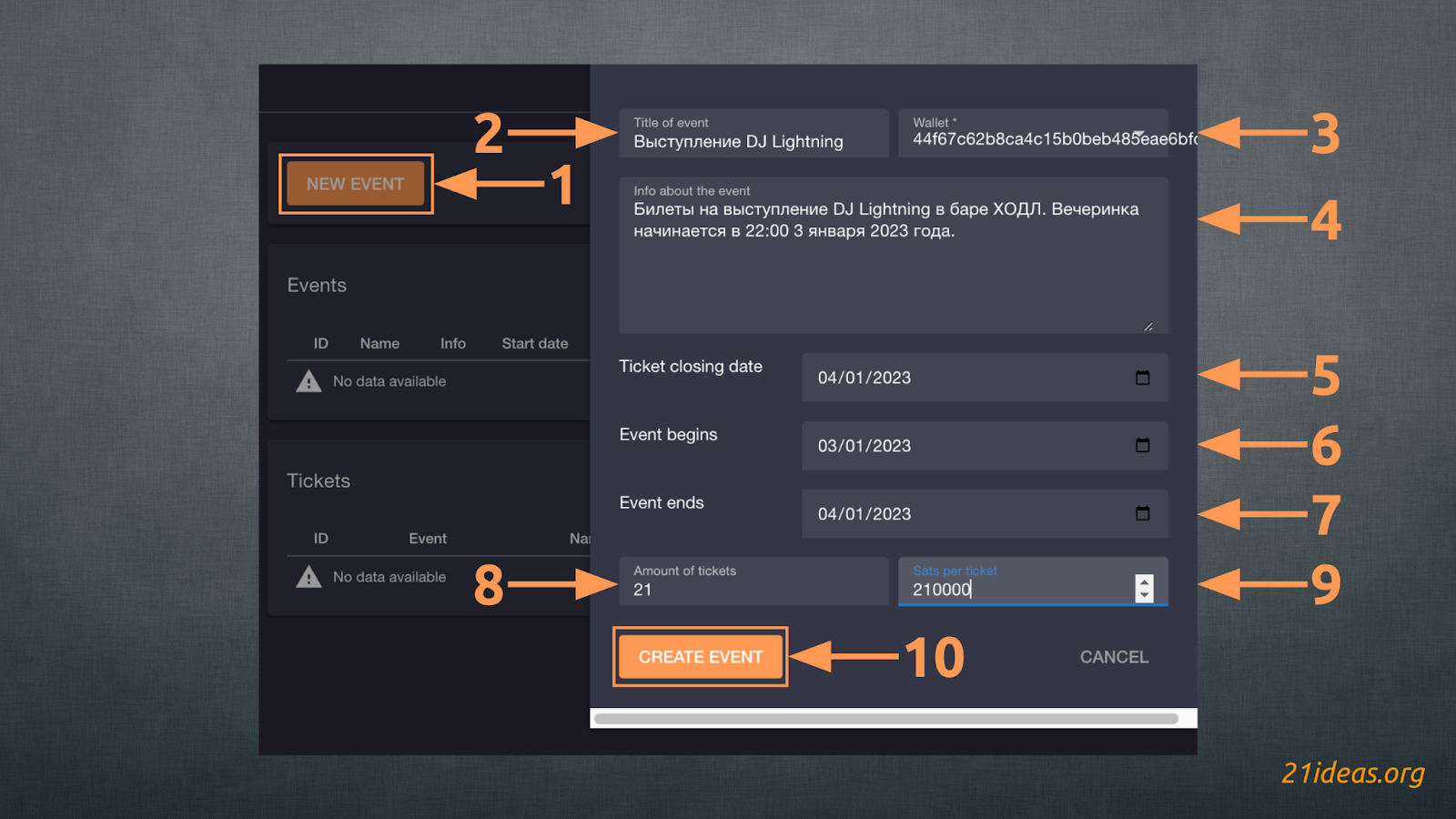 Переходим в расширение Events и нажимаем NEW EVENT (1). Вводим название мероприятия (2), выбираем кошелек (3), добавляем описание (4), указываем дату, вплоть до которой будут продаваться билеты (5), а также даты начала (6) и окончания мероприятия (7). Далее указываем количество доступных билетов (8) и цену за билет (9). Нажимаем CREATE EVENT (10) и готово – наше мероприятие с 21 доступным билетом создано. Вы можете делиться ссылкой на ивент и получать оплату за вход в сатошиках через сеть Молния. Вот так выглядит страничка оплаты билета в браузере (слева) и после скана предложенного после предоставления данных кода (справа скриншот Blue Wallet):