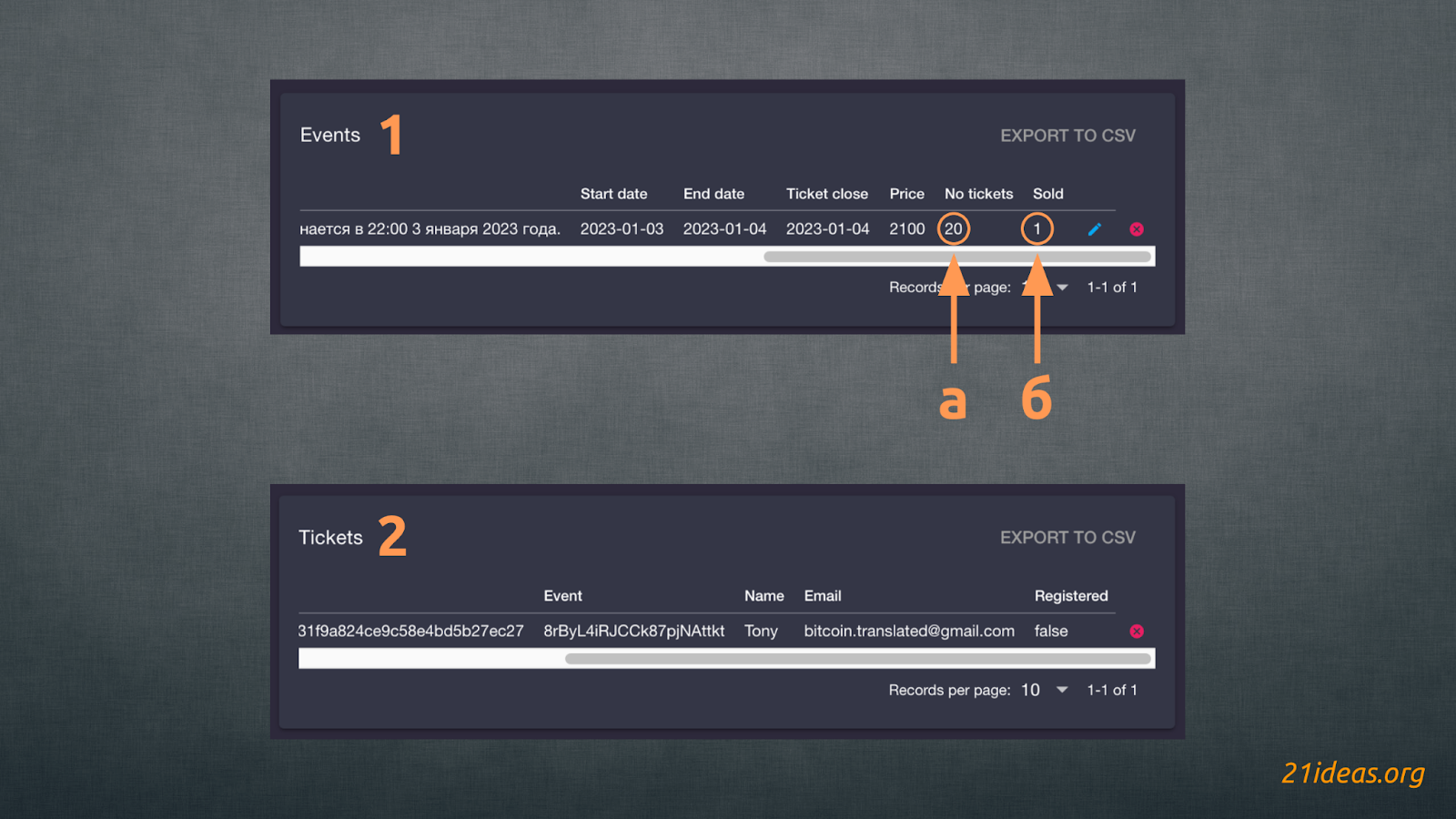 С каждым купленным билетом вы увидите обновление статуса (1) распродажи (надо проскроллить виджет до конца вправо). Будет обновляться как количество оставшихся билетов (а), так и количество проданных (б).
