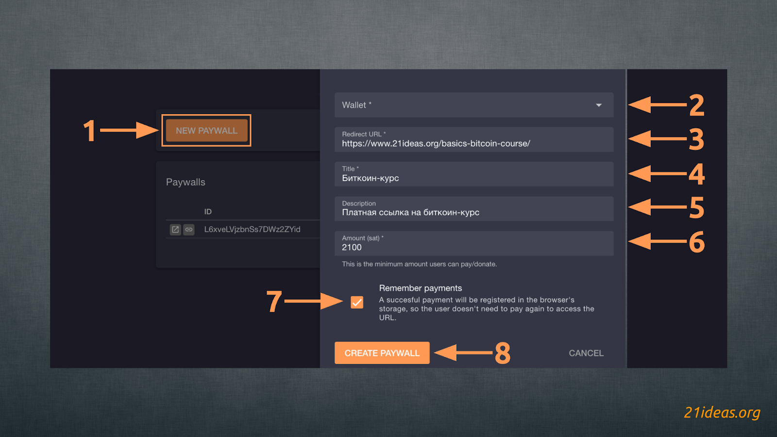 Нажимаем NEW PAYWALL (1), выбираем кошелек (2), указываем ссылку, на которую при оплате должен попасть отправитель (3). Указываем название (4) и описание (5) оплачиваемого материала, уточняем минимальную цену оплаты (6) – при желании отправитель может указать сумму выше указанной вами, оставив вам тем самым чаевые. Поставив галочку в поле Remember payments (7) вы отмечаете, что каждый пользователь, оплативший материал, может вновь переходить по указанной ссылке, не будучи обязанным вновь платить за переход.