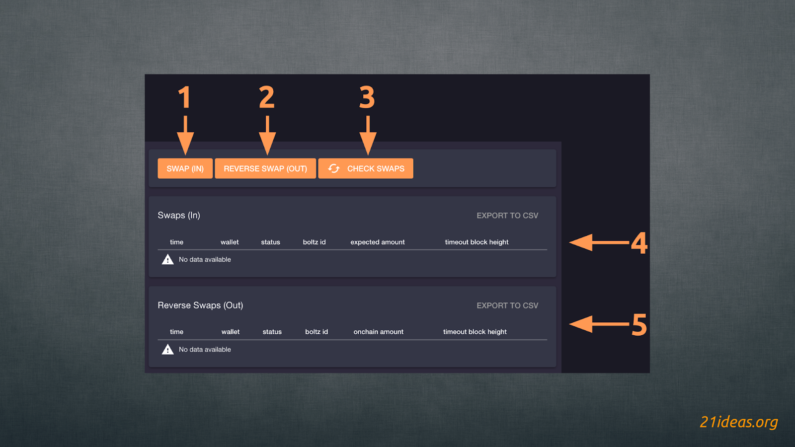 SWAP (IN) подразумевает отправку сатошиков из сети Молния (1), REVERSE SWAP (OUT) – наоборот (2). Кнопка CHECK SWAPS (3) обновляет статус виджета. По мере проведения свопов на карточках ниже (4), (5) будут отображаться проведенные свопы.