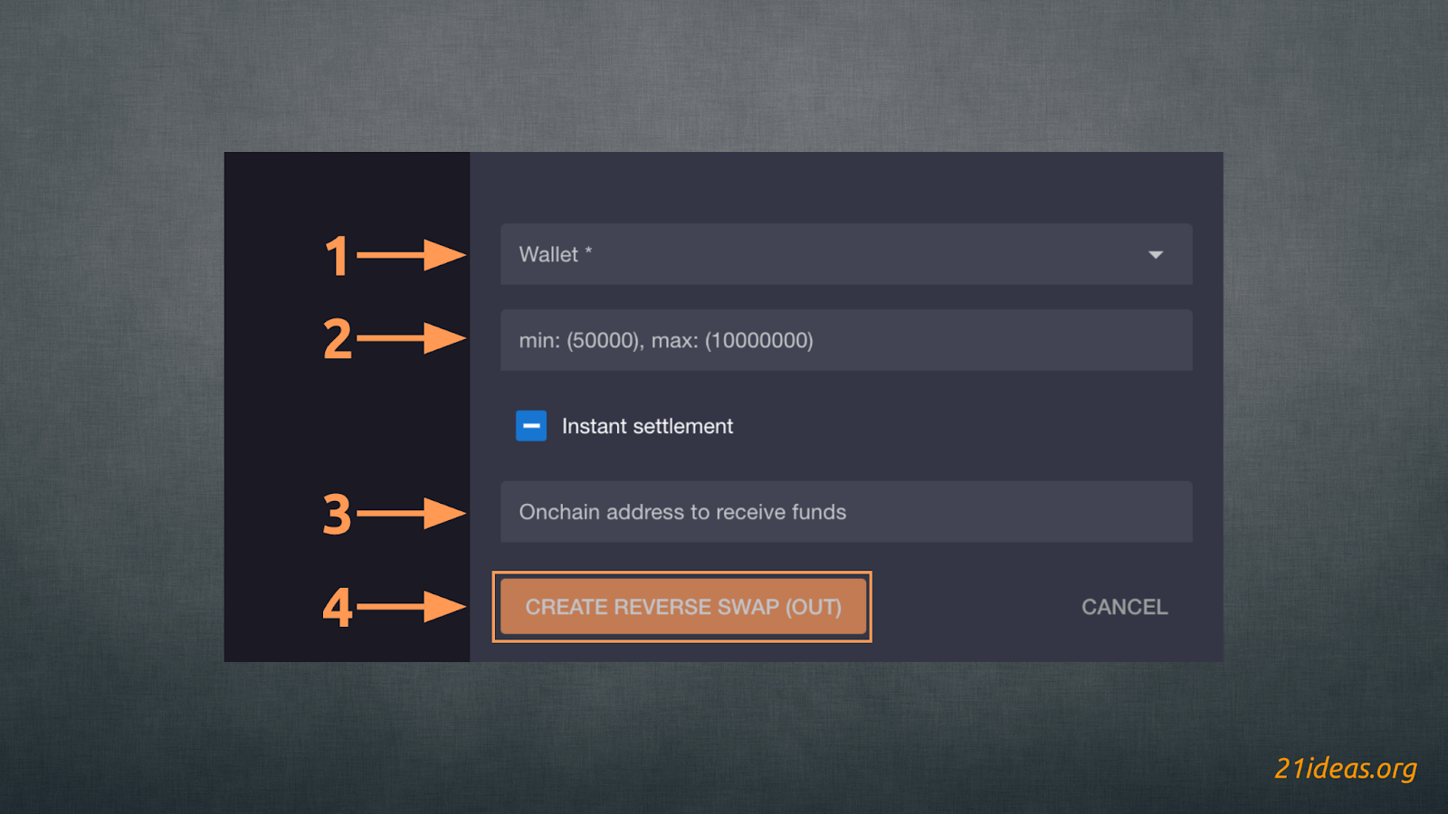 - Указываем кошелек, с которого LN-саты отправятся на ончейн-адрес