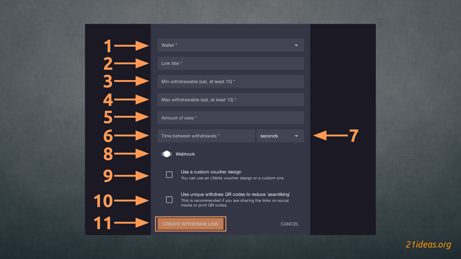 Выбираем кошелек (1), название ссылки (2), минимальную (3) и максимальную (4) сумму, доступную к снятию, количество доступных “ваучеров” (5), задержку между выводами средств (6) – это не позволит пользователям быстро повторно снимать средства. Меню под номером (7) позволяет выбрать единицы ожидания – секунды / минуты / часы. Также можно добавить веб-хук (8). Поставив галочку в пункте (9) вы сможете добавить ссылку на собственный дизайн ваучера LNURLw. Галочка в (10) пункте остановит подписчиков от повторного снятия средств. Это достигается генерацией нового QR-кода для каждого получения. Заполнив все поля нажимаем CREATE WITHDRAW LINK (11), и ссылка готова. Пользователи, перешедшие по ссылке смогут отсканировать QR-код любым кошельком, поддерживающим LNURL и снять немного сат. Вот как это выглядит в кошельке Blue Wallet: