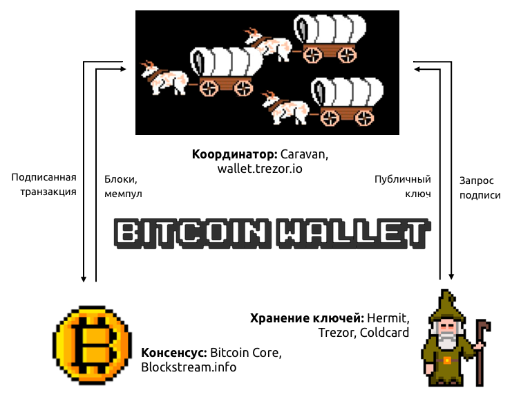 Координация – рассчитывает и отображает балансы, создает транзакции, производит запросы на подпись.