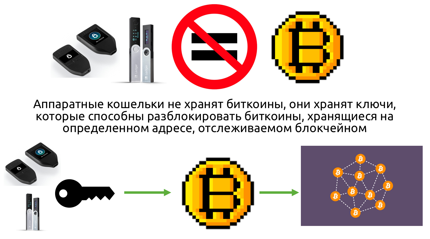Ни в какой момент времени биткоин не “хранится” на аппаратном устройстве. Аппаратное устройство просто хранит коллекцию ключей, которые могут санкционировать расходование биткоина, что отслеживается по выходам неизрасходованных транзакций (UTXO), расположенным по адресам, отслеживаемым блокчейном. Блокчейн живет на тысячах компьютеров, распределенных по всему миру. Ваш биткоин “живет” в блокчейне; ваше аппаратное устройство хранит ключи (не биткоин), но эти ключи необходимы для передачи биткоина. А кошелек – это пользовательский интерфейс для взаимодействия с адресами, которые находятся под контролем приватных ключей, координируемых программным или аппаратным обеспечением.