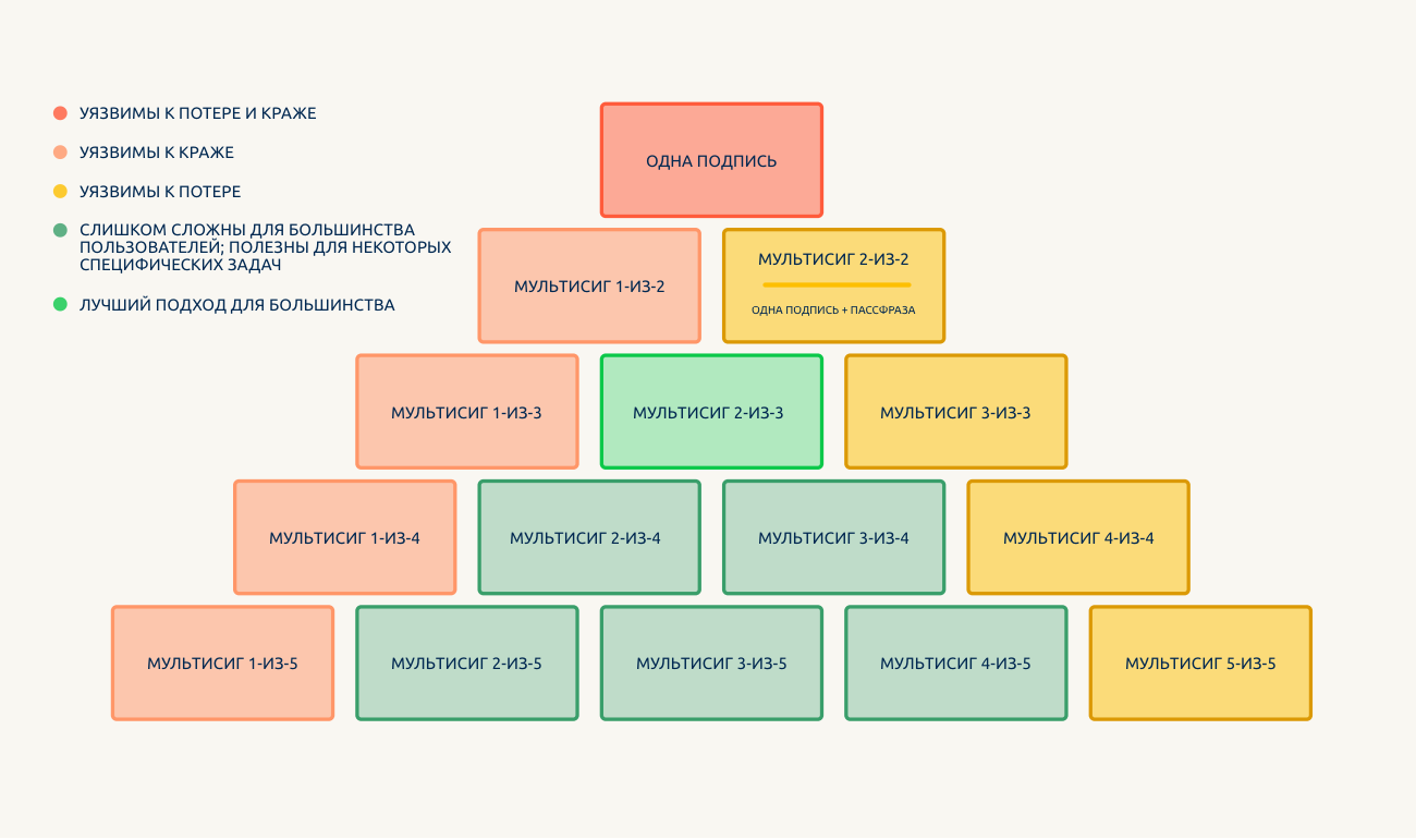 Некоторые схемы могут подвергать вас риску кражи, а другие - риску потери. Мультисиг 2-из-3 защищает вас от обоих рисков, привнося при этом минимум усложнений.