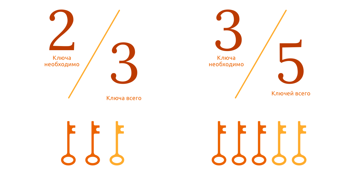 Мультисиг-кворумы настраиваются в соответствии с потребностями пользователя, поэтому их можно расширить практически до любого размера: 5-из-6, 2-из-9 или любое другое сочетание. Однако некоторые кворумы значительно популярнее других. 2-из-3 и 3-из-5 являются наиболее распространенными схемами для защиты биткоина в холодном хранилище; о них мы и расскажем ниже.