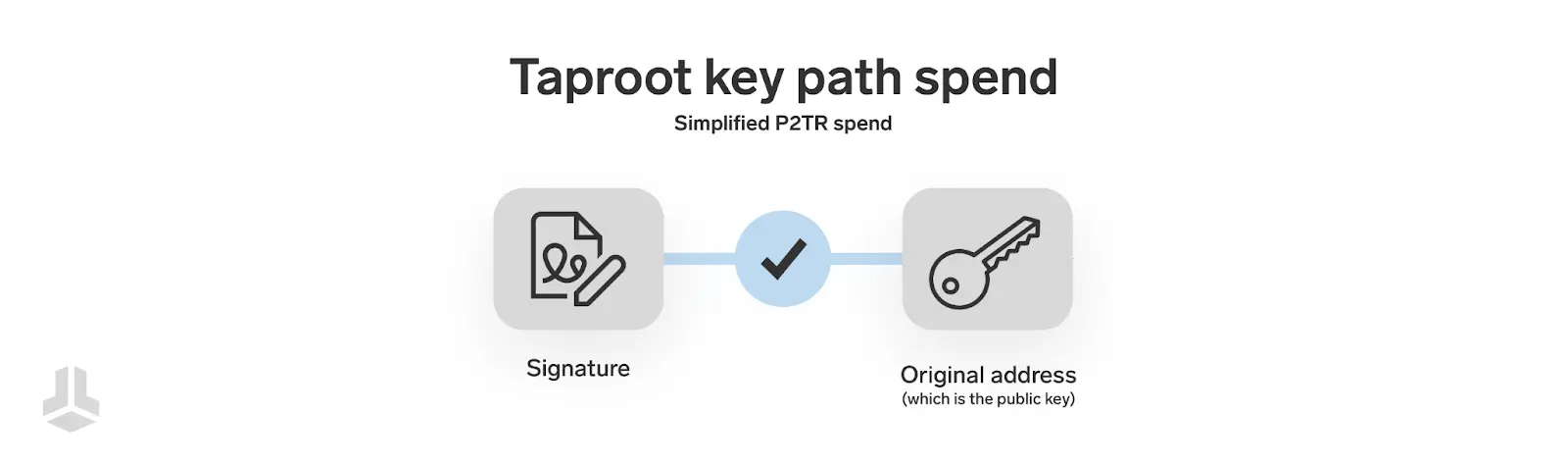 Стандартный или “предпочтительный” способ использования Taproot — это трата через ключ (key path spend), и он довольно прост для понимания: Taproot-выход содержит один публичный ключ, и, соответственно, такой выход можно потратить с помощью одной подписи. Если при попытке потратить Taproot-выход вы предоставляете только подпись, без какого-либо скрипта, — значит вы совершаете трату через ключ. Обычная транзакция с Taproot-адреса является именно тратой через ключ.