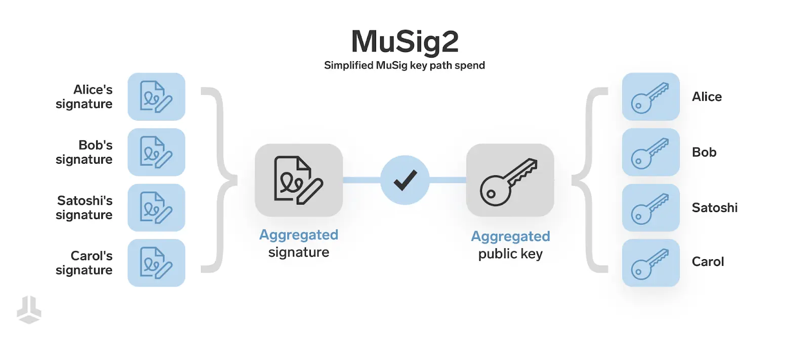 Теперь, когда у нас есть базовое понимание Биткоин-скриптов и того, как работают различные пути расходования, мы можем углубиться в различные схемы мультиподписи и то, как они используют возможности Taproot. Выше мы уже упомянули возможность “скрыть” мультисиг-кошелек за простой тратой через ключ — но как это возможно? Как одна подпись может представлять сразу нескольких подписантов?