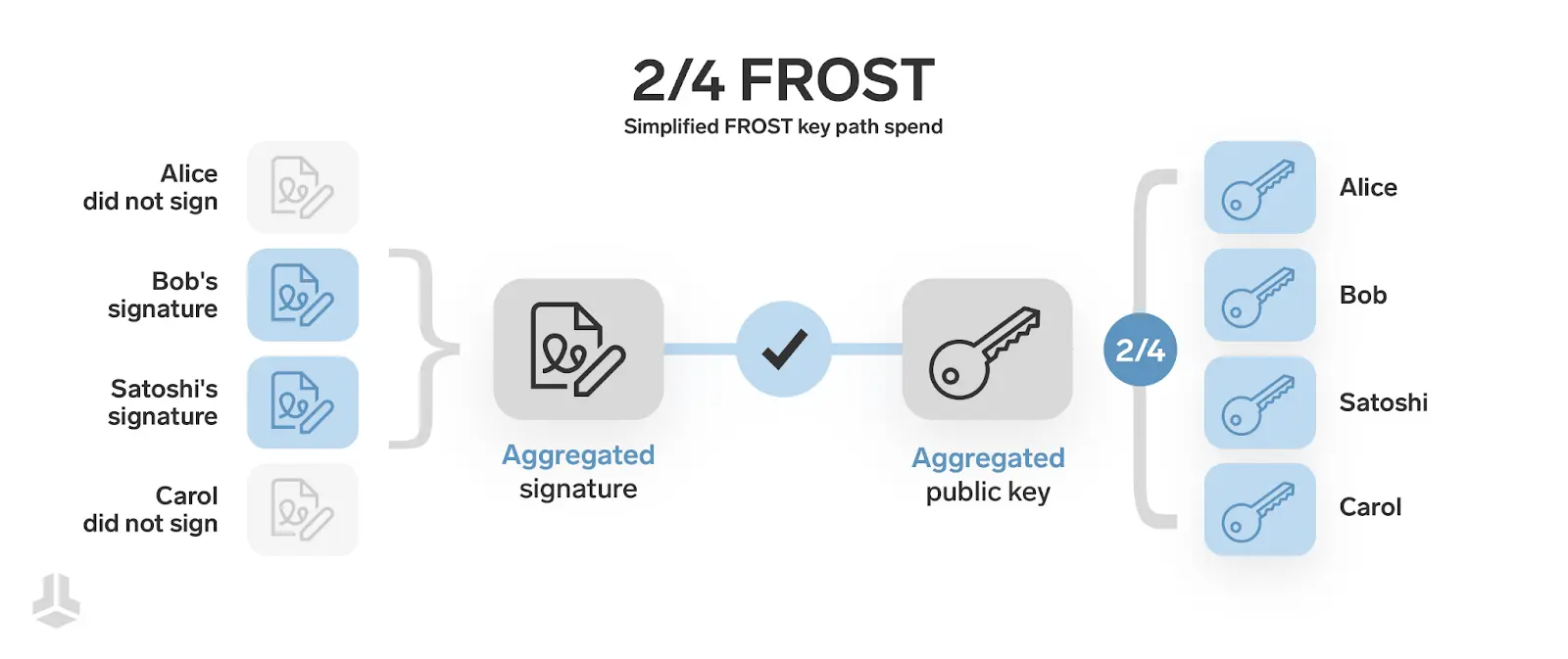 FROST (Flexible Round-Optimized Schnorr Threshold) — это интерактивная схема пороговой подписи, позволяющая части владельцев ключей подписывать транзакции, оптимизируя скорость и гибкость Multisig.
