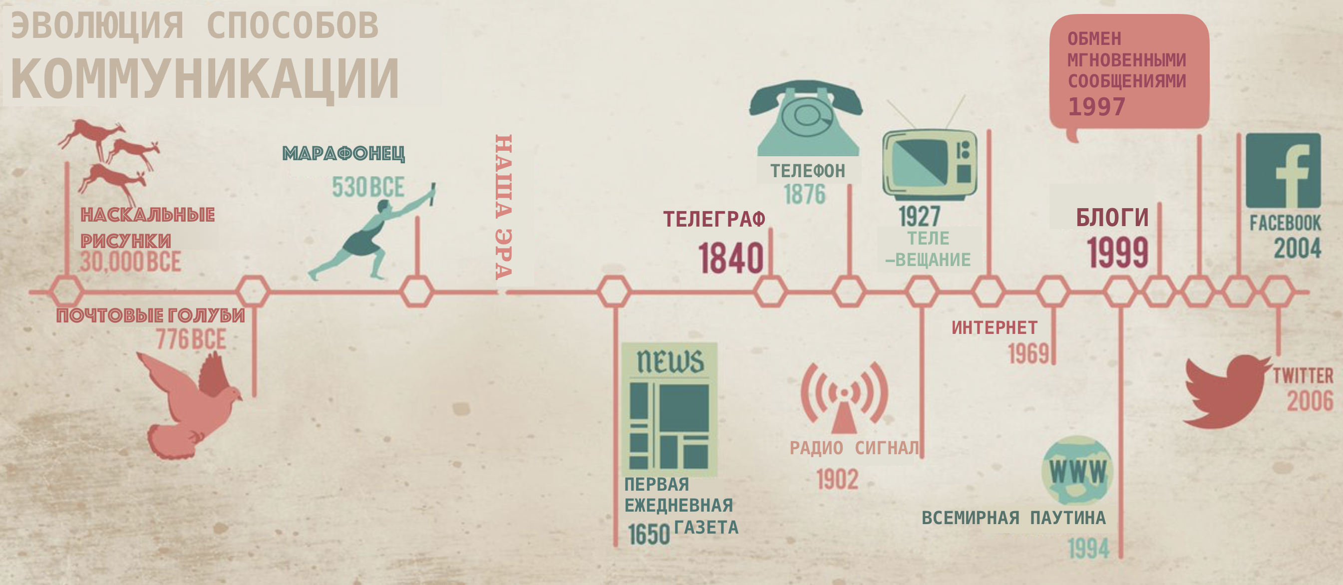 Тем не менее, телекоммуникационные технологии, которые мы используем для общения, со временем развиваются (от наскальных рисунков до почтовых голубей, газет, телеграфов, телефонов и цифровых медиа).