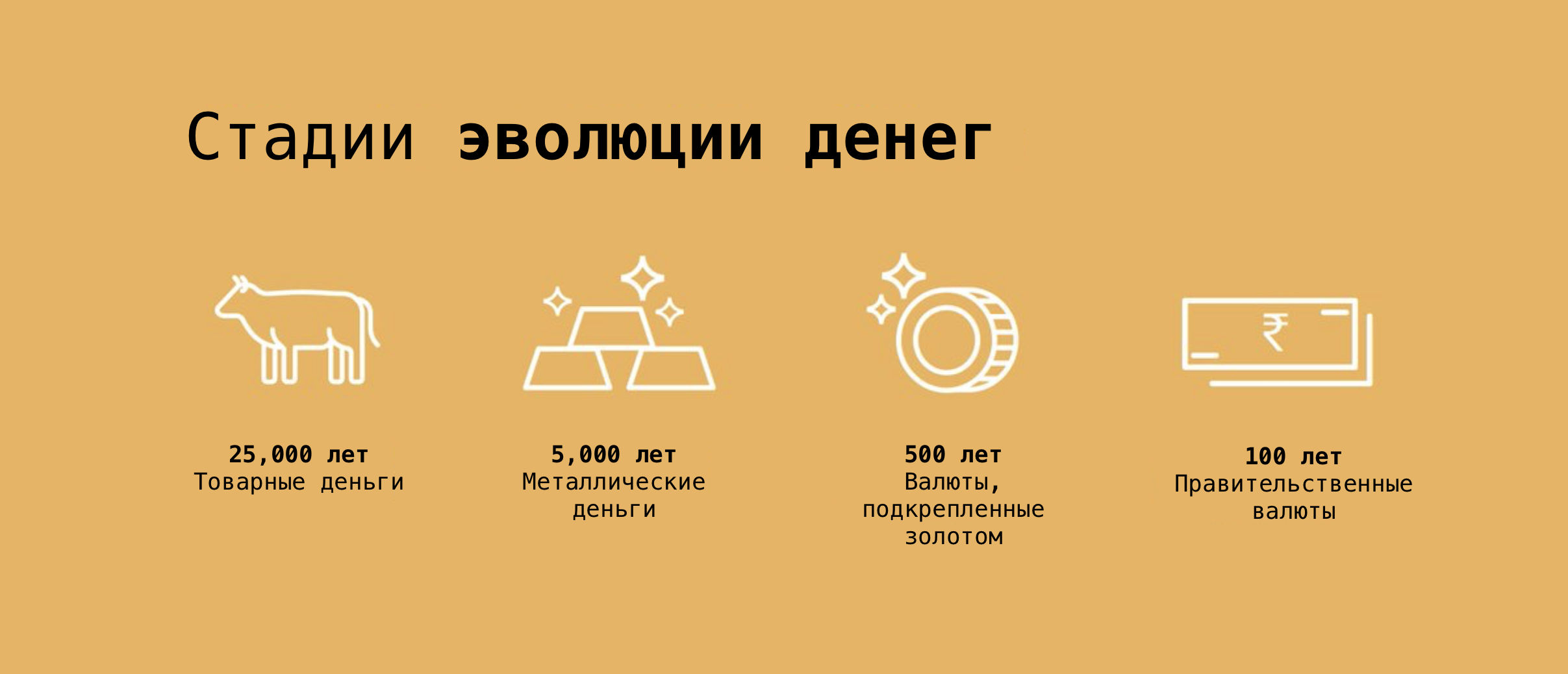 За всю историю деньги эволюционировали много раз — они принимали форму ракушек, соли, скота, камней, драгоценных металлов и, совсем недавно, правительственной бумаги.