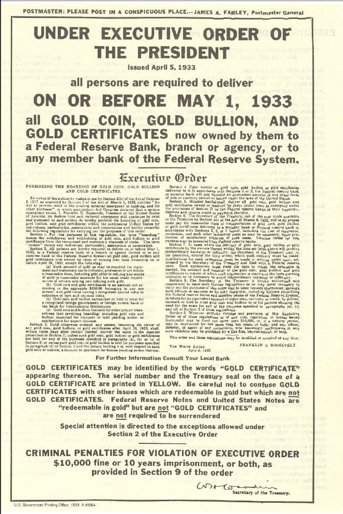 В 1933 году распоряжение №6102 обязало всех граждан США обменять свои золотые запасы на доллары США под угрозой тюремного заключения сроком до 10 лет.