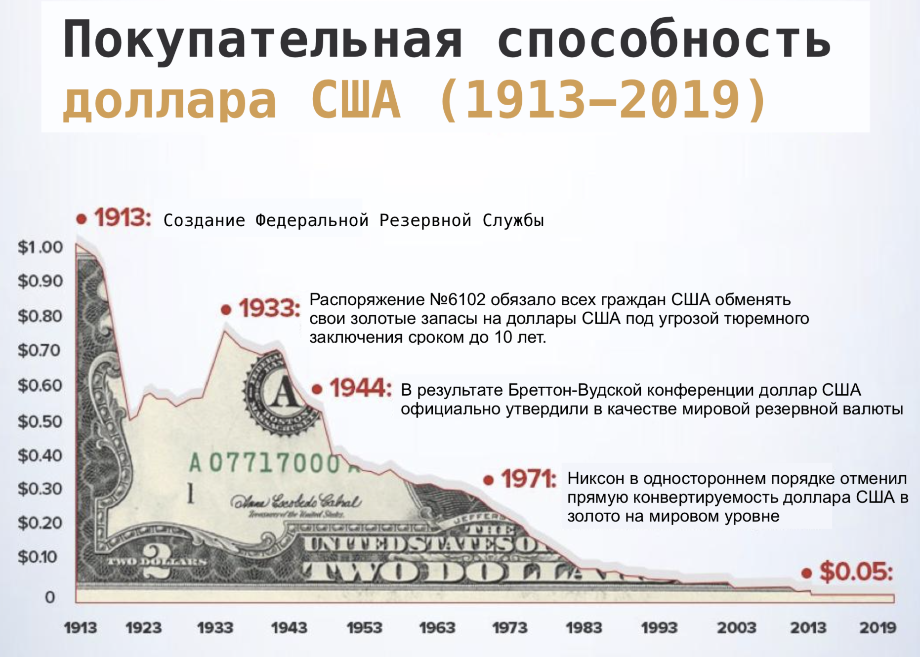 В 1971 году президент США Никсон в одностороннем порядке отменил прямую конвертируемость доллара США в золото на мировом уровне. Никсон, тем не менее, пообещал, что США, в конечном итоге, вернутся к золотому стандарту. Но этого, конечно, не произошло и основой мировой экономики так и остался фиатный стандарт во главе с долларом США.