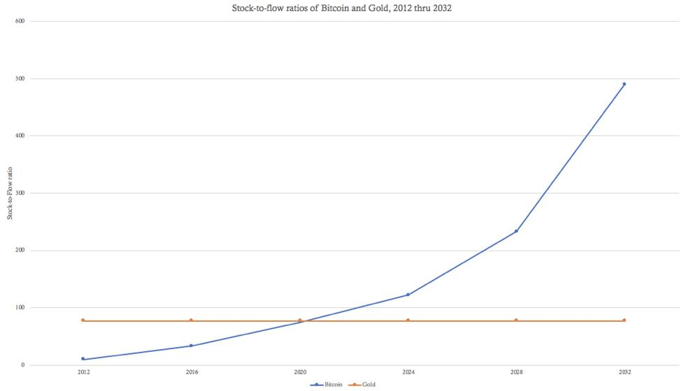 Отношение запаса к потоку биткоинов неизбежно увеличивается каждые 4 года, а в мае 2020 года оно будет превосходить таковое у золота. Денежная политика Биткоина обеспечивается криптографией, не подлежащей вмешательству, и, следовательно, неизбежностью исполнения (так же, как 1 + 1 = 2).