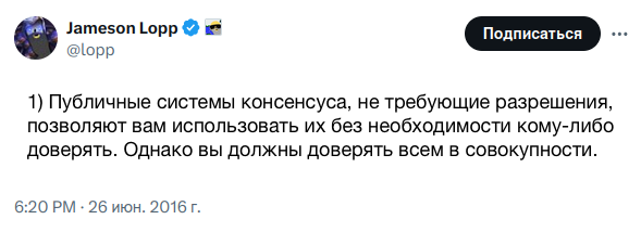 Я считаю, что у Биткоина гораздо больший потенциал, чем тот, которого мы достигли на данный момент. Я рассматриваю блокчейн Биткоина как криптографический аккумулятор для самых разных систем, которые могут к нему подключиться. Но мы лишь едва нащупали основу возможного. Закостенев сегодня, когда так сложно создавать вторые слои, не требующие разрешения, мы сковываем разработчиков и значительно ограничиваем эксперименты по поиску наиболее ценных вариантов использования пространства блокчейна.