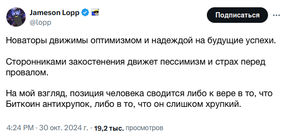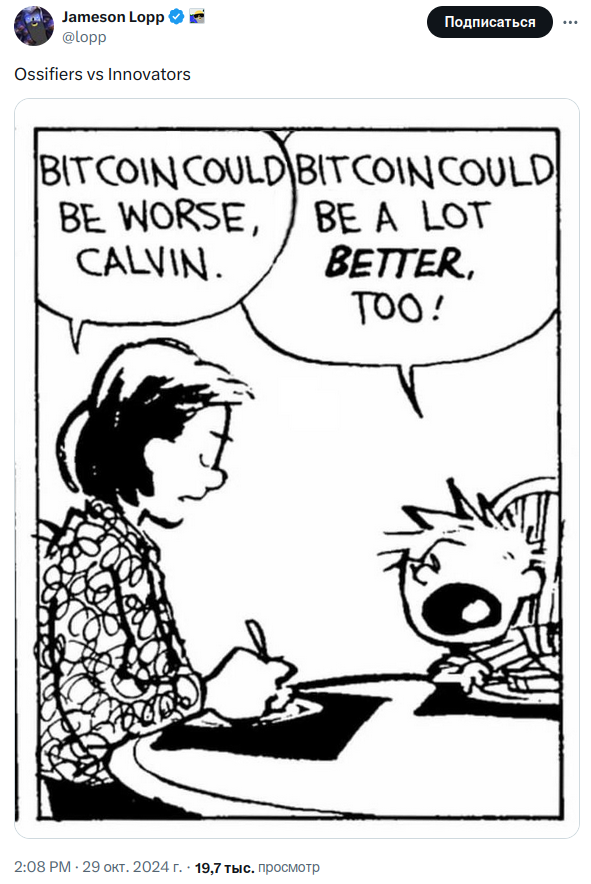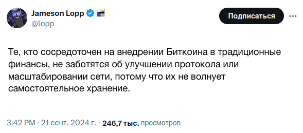 Я считаю, что Биткоин может оставаться живым, актуальным и безопасным в долгосрочной перспективе только благодаря готовности осторожно на основе консенсуса внедрять разумные, полезные для широкого круга пользователей, усовершенствования протокола. Зацикливание на замораживании прогресса в текущий момент времени - это высокомерие, аисторичность и отказ от дальновидности, благодаря которой Биткоин был изначально создан. Продуманная непрерывная эволюция - ключ к долгосрочной ценности Биткоина. Цифровое золото превосходит физическое именно потому, что оно не инертно. Я имею в виду, что свойства физического золота не могут быть улучшены, поэтому финансовые инновации золота происходили через централизованные долговые расписки (IOU)… но свойства Биткоина могут быть улучшены, что способствует его свободному использованию.