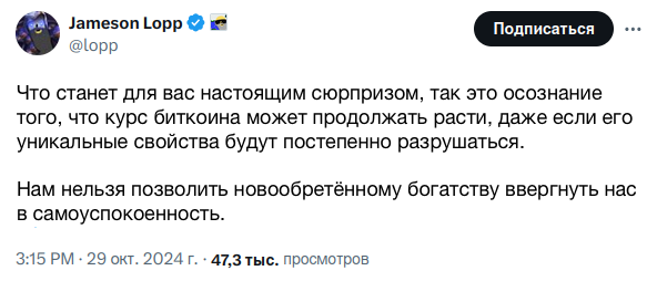 Как я отмечу позже, само по себе закостенение также может привести к тому, что Биткоин окажется в руках групп с определёнными интересами. Ответ не в параличе, а в бдительности и способности адаптироваться к новым вызовам и противникам!