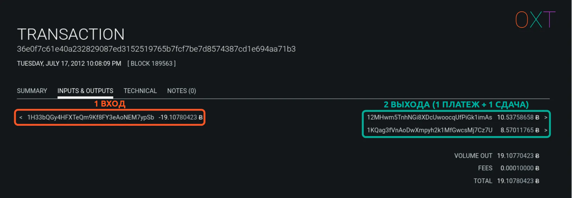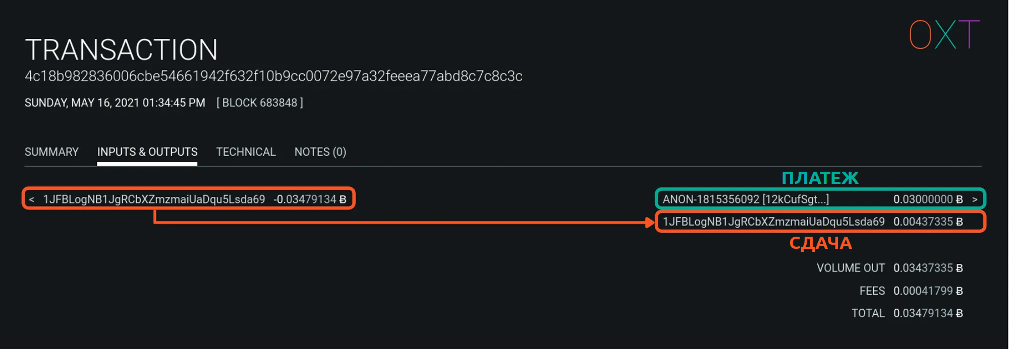 Когда расходуется один UTXO на большую сумму, чем предполагаемая сумма платежа, пользователь получает UTXO сдачи на оставшуюся сумму обратно на адрес, сгенерированный из приватного ключа его кошелька.