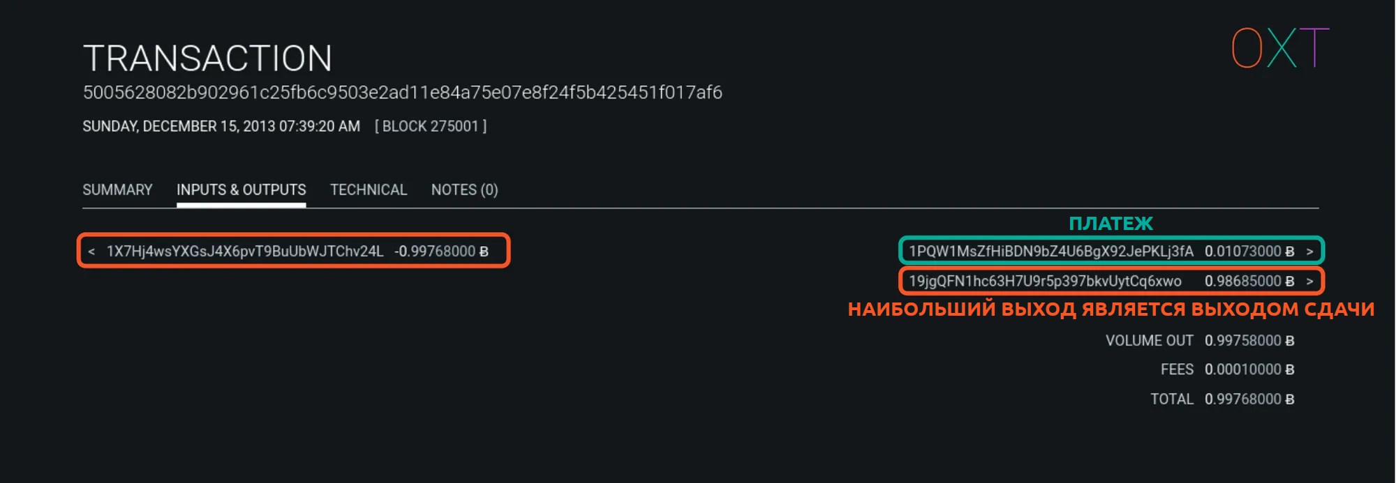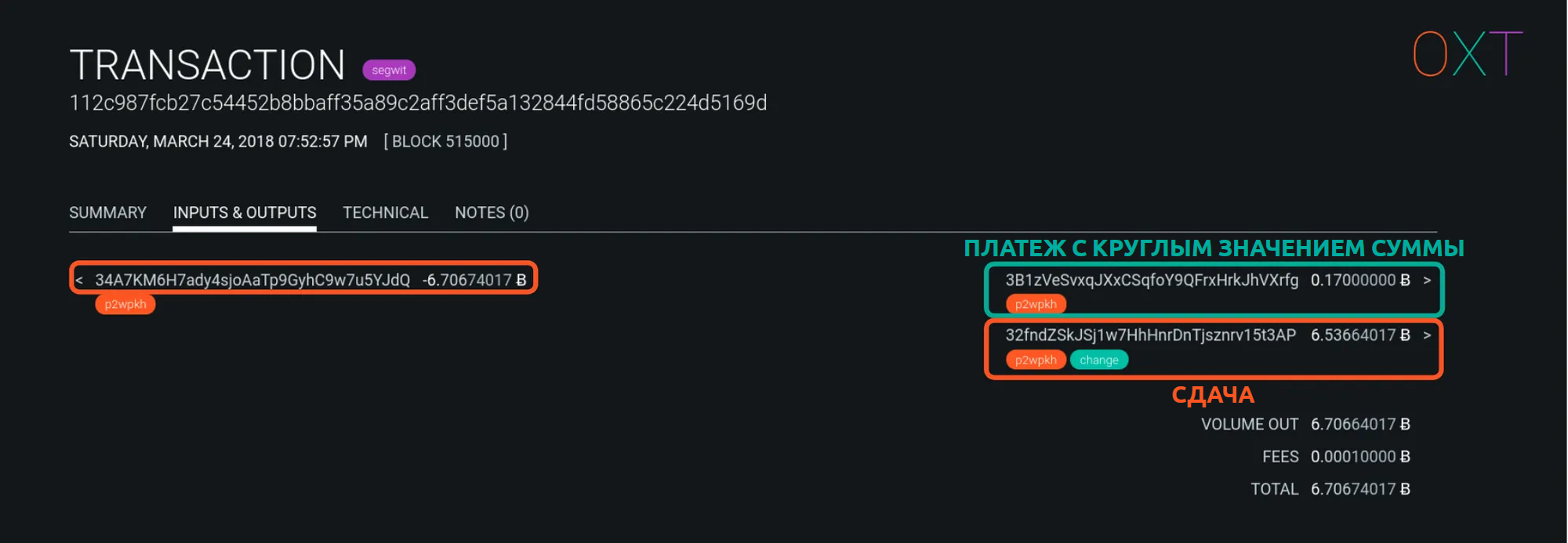 В этом разделе мы будем выявлять выходы сдачи на основе внутренних данных транзакций. Эвристики представлены в порядке убывания эффективности. Будут приведены примеры и показаны аннотированные скриншоты, чтобы помочь пользователям визуализировать эти концепции.