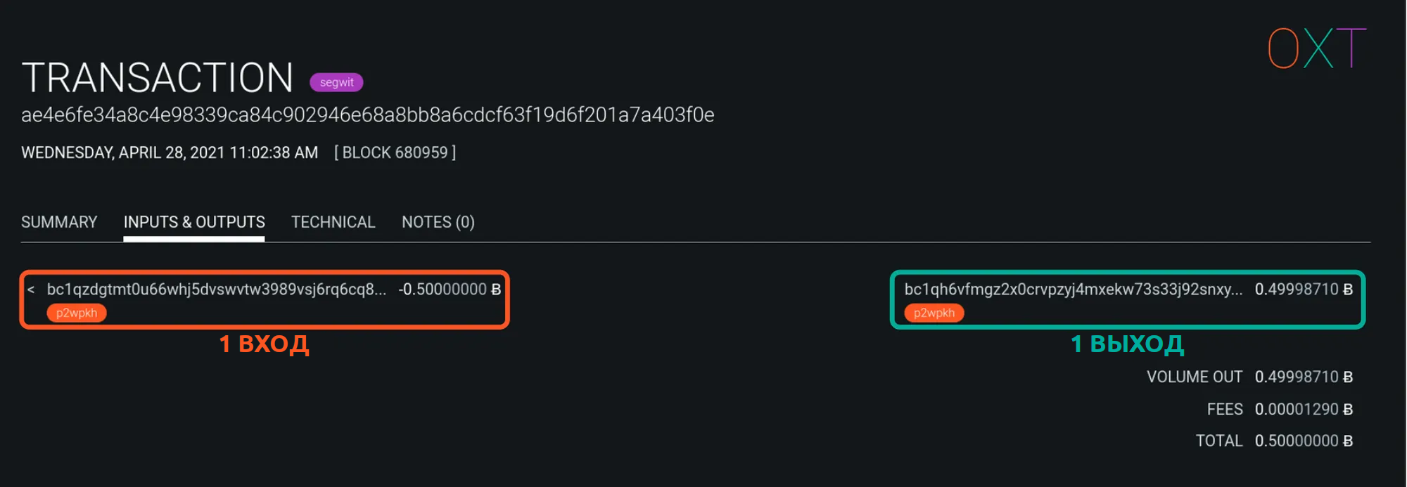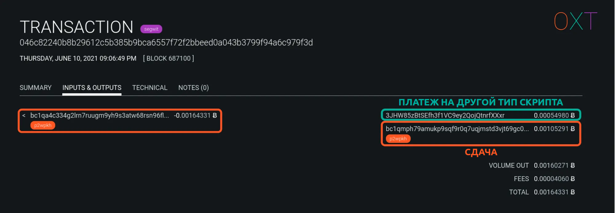 Пример транзакции с платежным выходом на другой тип скрипта Биткоин-адреса