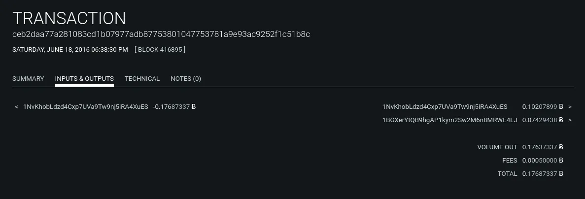 Другая простая эвристика предполагает, что наибольшая сумма выхода является вероятным выходом сдачи. Это одна из самых слабых эвристик, особенно если брать ее в отдельности, но, как мы обсудим во второй части, эта эвристика может быть полезна при анализе графа транзакций.