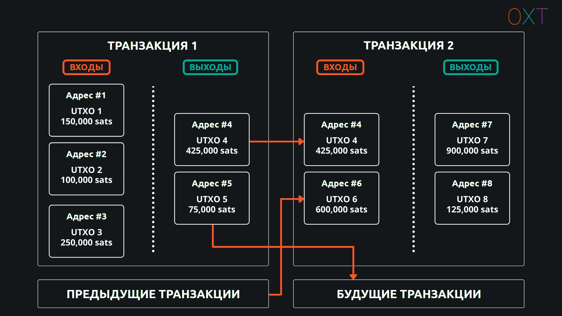- Движения UTXO и фундаментальная связь между входами и выходами.