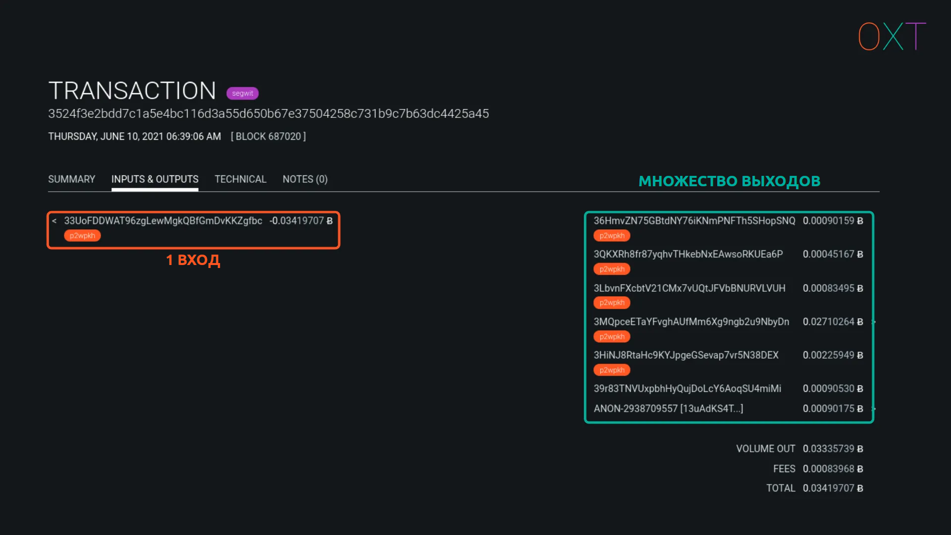 - В этом разделе также приводится описание и примеры использования инструмента OXT для анализа графа транзакций и схемы кластеризации кошельков.