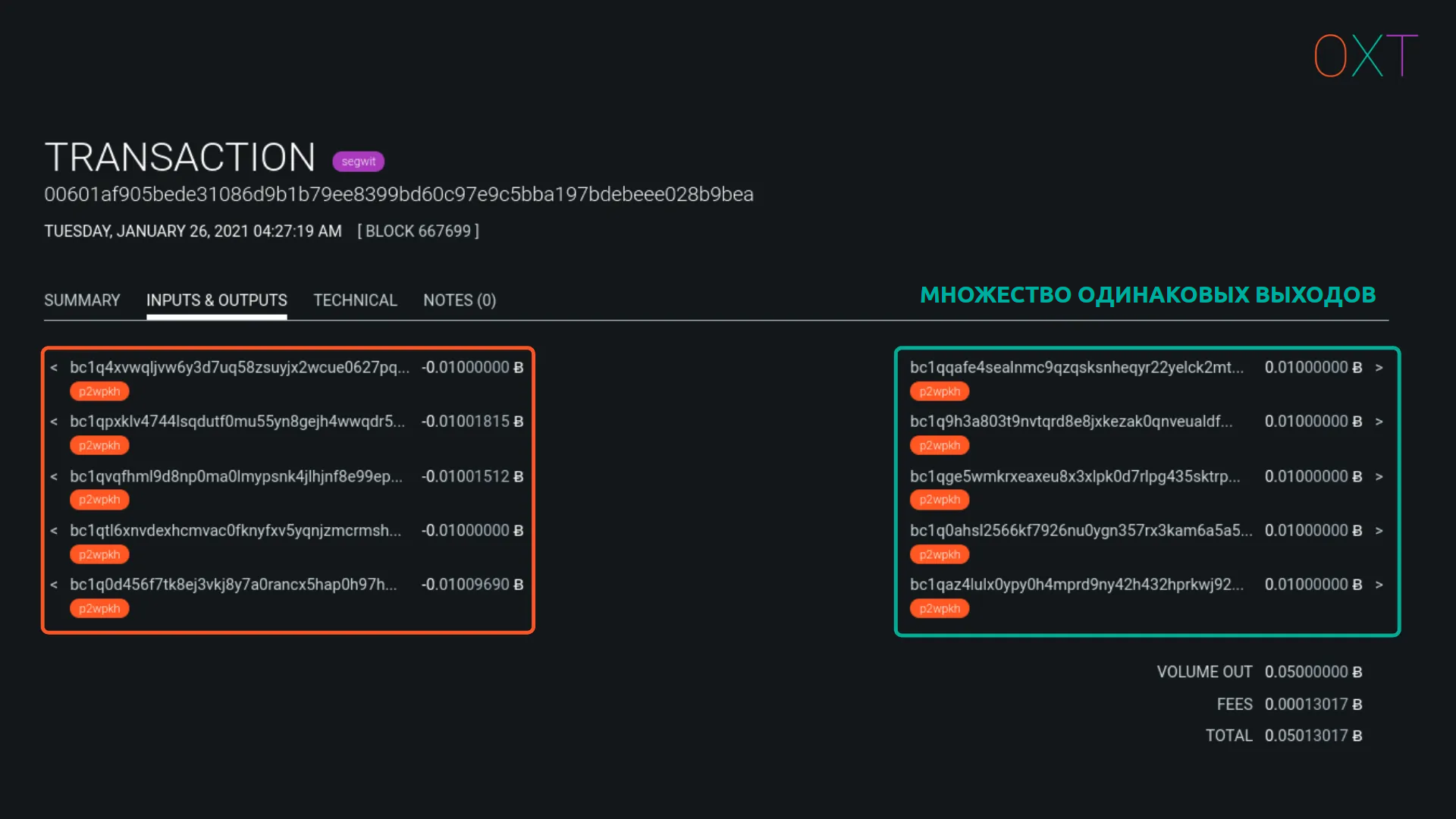 Совместные транзакции предполагают работу нескольких пользователей для выполнения одной транзакции, что повышает конфиденциальность участников. Такие транзакции легко идентифицируются по одинаковым суммам на выходе.