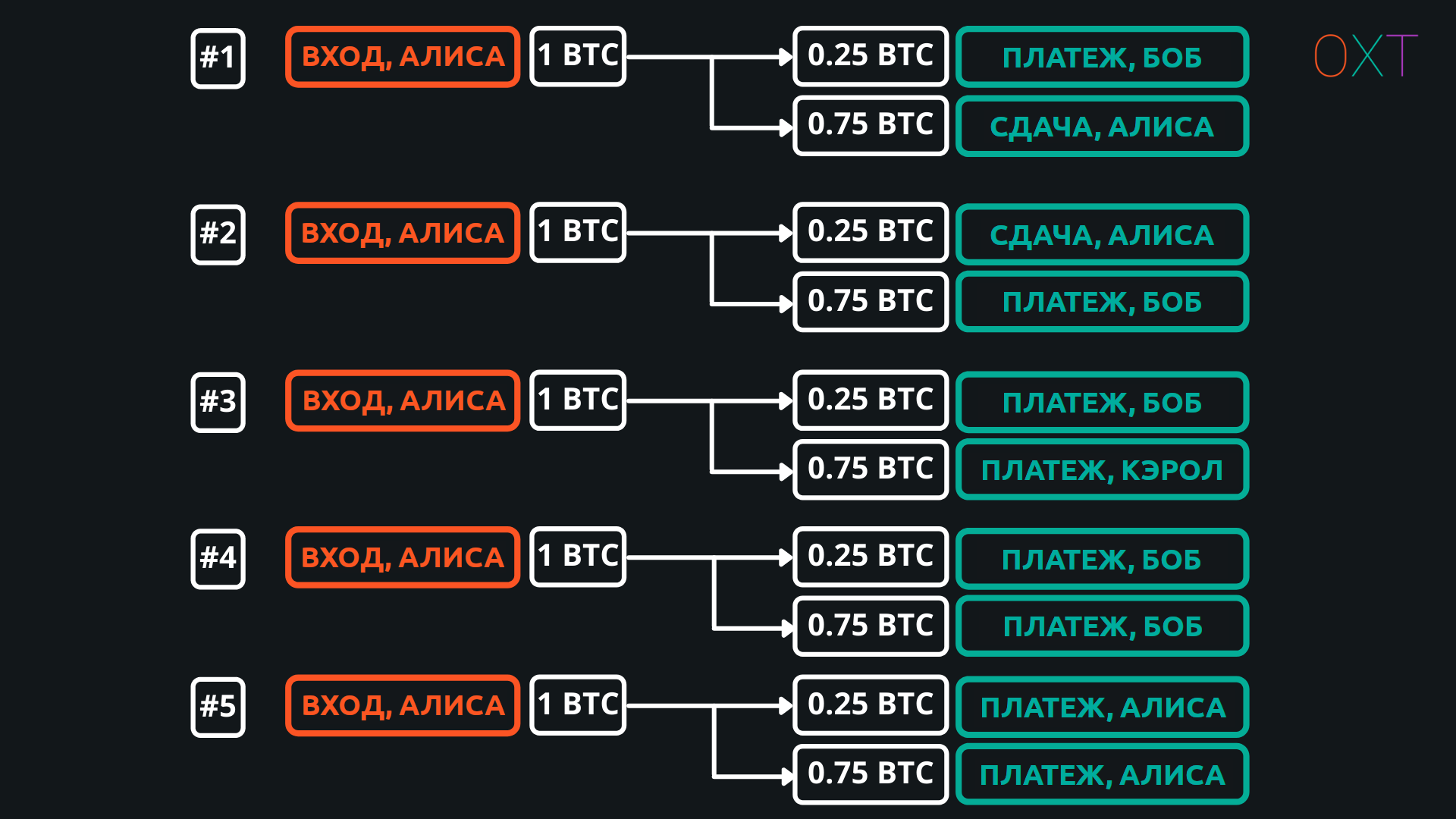 Типичное поведение пользователя делает наиболее вероятными интерпретации 1 и 2. Интерпретации 3 и 4 возможны, хотя многие Биткоин-кошельки не имеют функции пакетной траты. Интерпретация 5 встречается редко из-за дополнительных комиссий и увеличения количества UTXO.