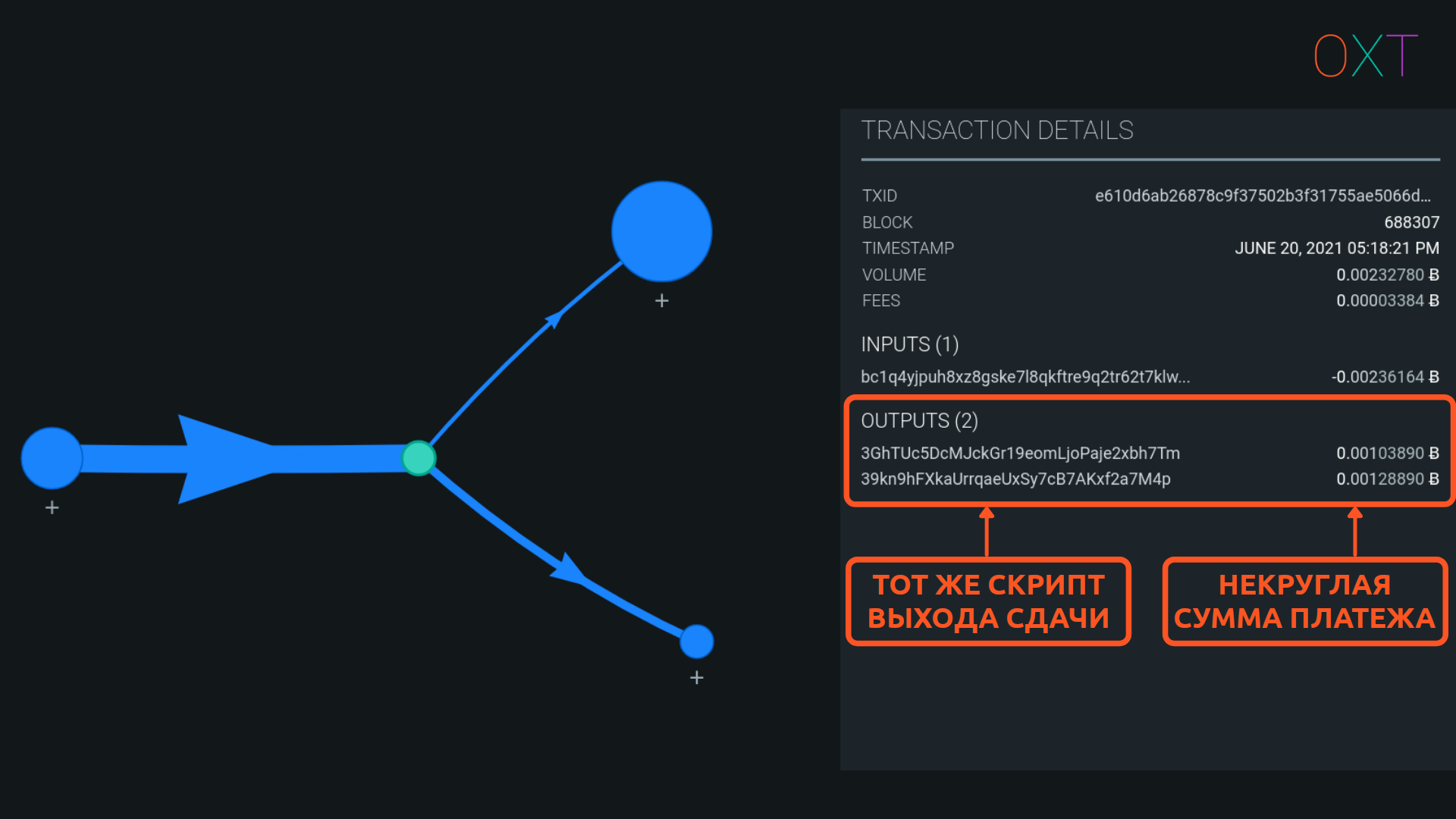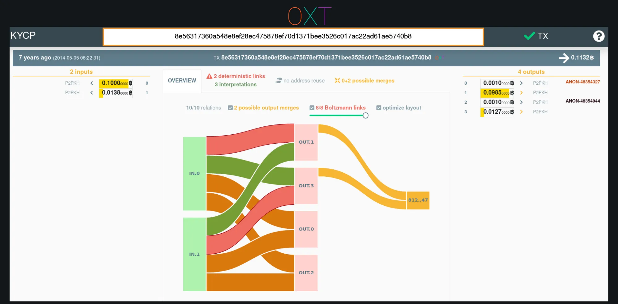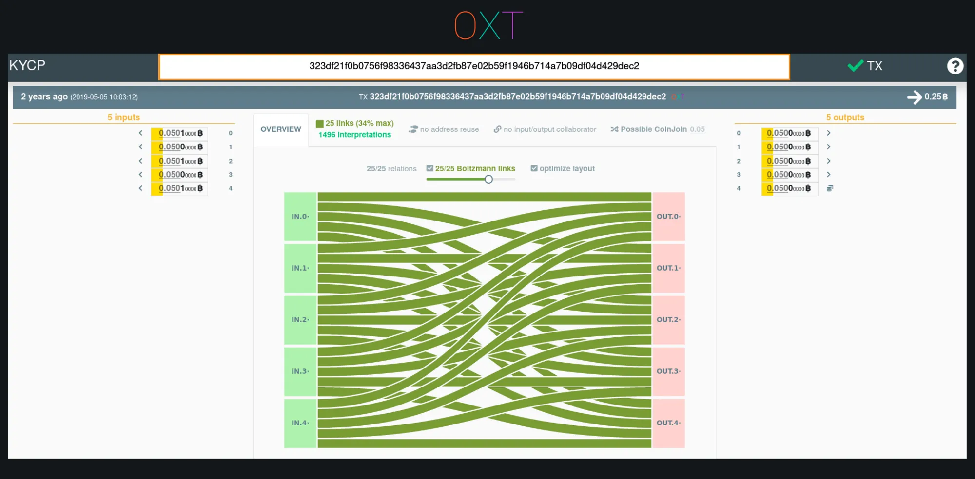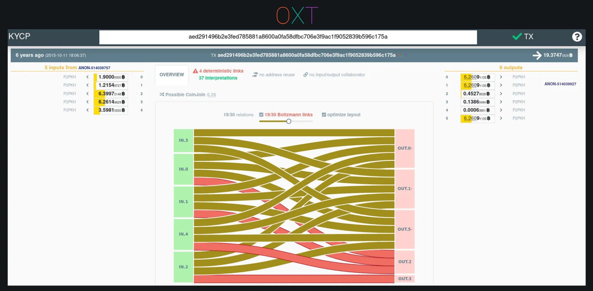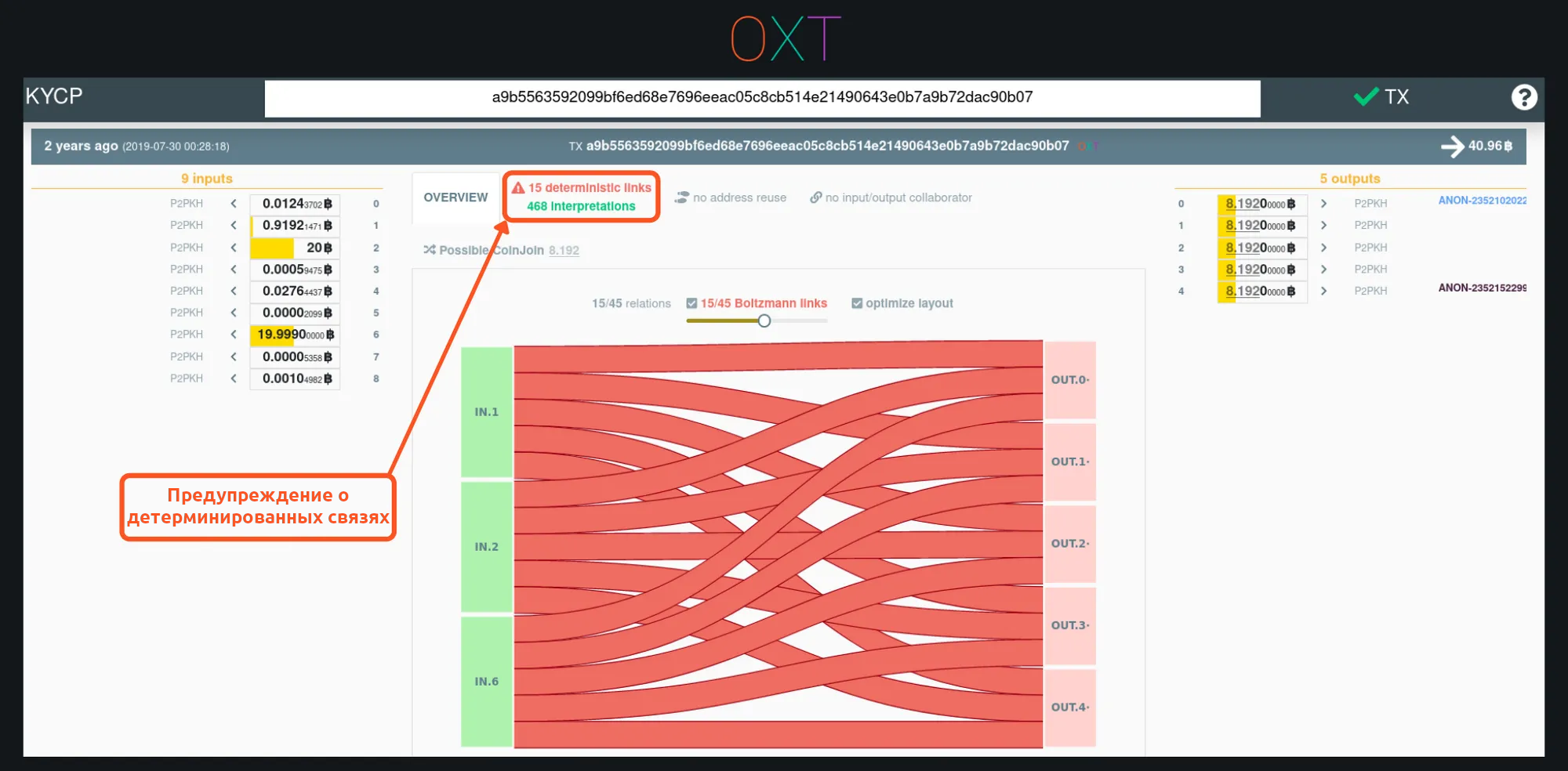 Связь между входами и выходами может быть отображена на графе транзакций OXT путем выбора входа или выхода. Визуализатор транзакций на сайте kycp.org также показывает внутритранзакционные связи.