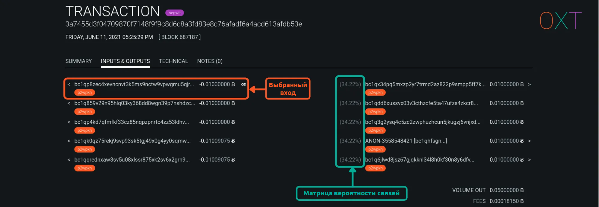 Результат LPM транзакции можно найти на странице TRANSACTION в OXT. На вкладке INPUTS & OUTPUTS подмножество связей между входом и каждым выходом можно увидеть, кликнув по значку “цепочки” справа от нужного UTXO.