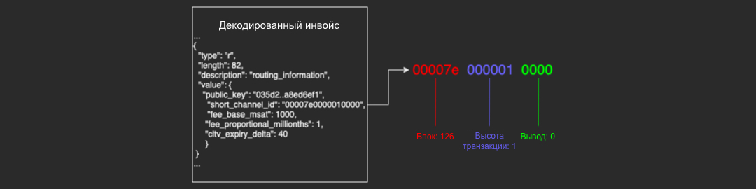 Инвойс с инструкциями приватной маршрутизации включает идентификатор канала, который, в свою очередь, содержит информацию о UTXO.