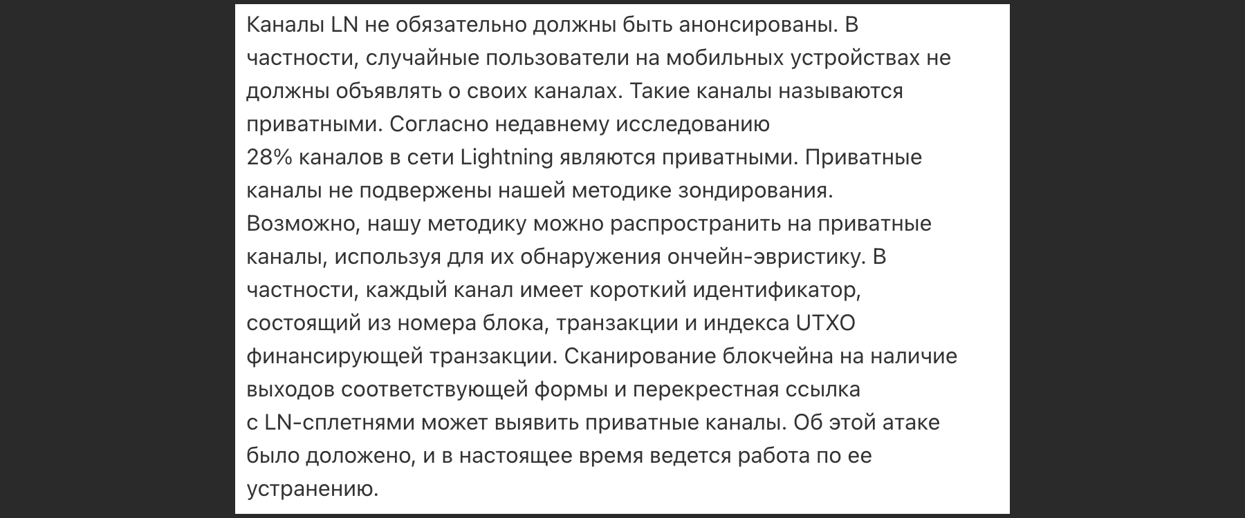 Таким образом, даже если ваш узел “полностью приватный”, вы никогда не открывали публичный канал и не делились ни с кем инвойсами, достаточно, чтобы один из ваших партнеров по каналу раскрыл ваш приватный канал и публичный ключ через инвойс. После этого злоумышленник может прощупать ваши приватные каналы, UTXO, балансы и даже контрагентов по каналам. Поэтому можно предположить, что любой из ваших приватных каналов и поддерживающих их UTXO открыты для всего мира. Для определения стоимости и времени выполнения этой атаки на зондирование частных каналов потребуются дополнительные исследования.