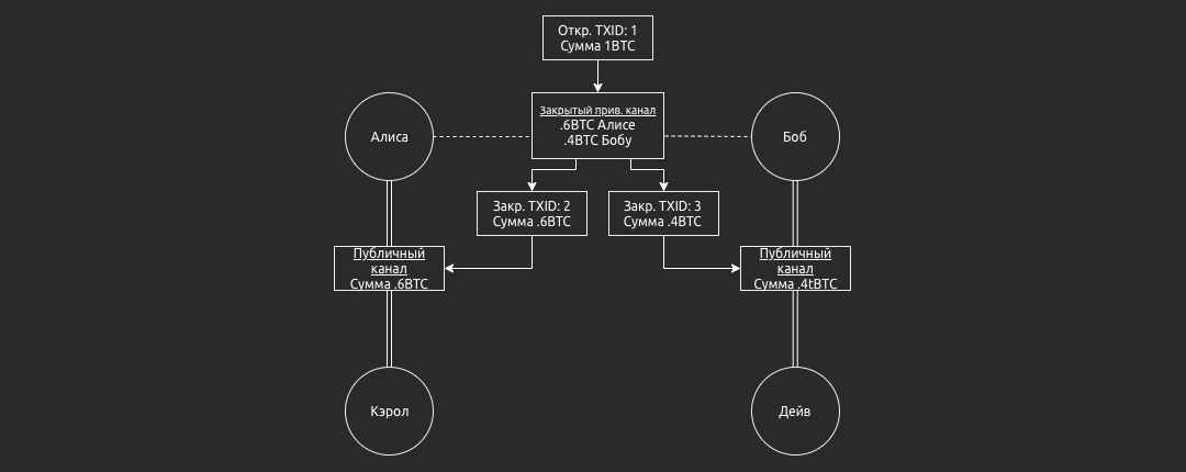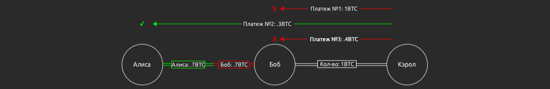 Если баланс канала Алисы с Бобом изменился и составляет 0.1 на ее стороне и 0.9 на его стороне, в то время как ни один из других балансов канала Боба не изменился, мы знаем, что Алиса заплатила Бобу 0.6 BTC. Либо одним платежом, либо несколькими.