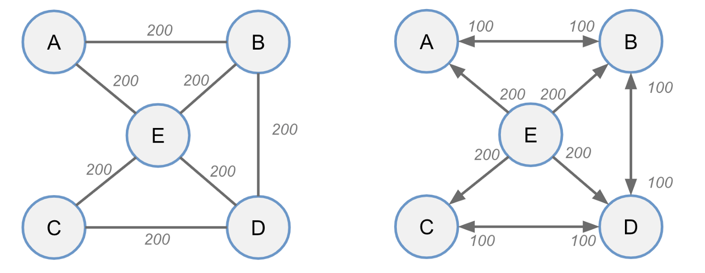 Упрощенный пример. Левый график показывает каналы и их емкость - информацию, видимую публично. Правый график показывает, как балансы на самом деле распределены внутри каждого канала (недоступная публично информация) и направления движения средств. Из картинки слева может показаться, что узел E имеет лучшее соединение. Но на практике все его балансы локальны, у него нет входящей емкости, и он не может принимать или маршрутизировать платежи.