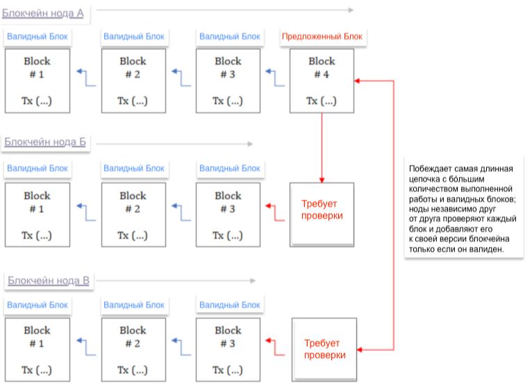 Каждый участник, управляющий нодой в сети Биткоин независимо проверяет каждую транзакцию и каждый блок; тем самым каждая нода собирает свою собственную независимую версию цепочки блоков. Консенсус достигается по всей сети, потому что каждая нода проверяет каждую транзакцию (и каждый блок) на основе набора ключевых правил (и выигрывает самая длинная цепочка). Если нода передает широковещательную транзакцию или блок, который не следует согласованным правилам, другие ноды отклонят ее, как недействительную. Именно эта функция позволяет Биткоину избавиться от потребности в центральной третьей стороне; сеть сходится на том же обоюдном состоянии цепи, и никому не приходится доверять какой-либо другой стороне. Тем не менее, валюта играет важную роль в координации механизма консенсуса Биткоина и упорядочивания блоков, которые в конечном итоге представляют полную и действительную историю транзакций Биткоина (или его блокчейна).