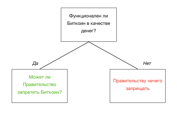 Идея о том, что правительства каким-то образом могут запретить Биткоин, является последней стадией скорби, непосредственно перед его принятием. Следствием заявления о запрете Биткоина является признание того, что Биткоин “работает”. По сути, это заявление означает, что Биткоин работает настолько хорошо, что он способен нести угрозу действующим государственным монополиям на эмиссию денег, и в этом случае правительства будут его регулировать с целью устранения этой угрозы. Расценивайте утверждение о запрете Биткоина правительствами, как условный аргумент. Функционален ли Биткоин в качестве денег? Если нет, правительствам нечего запрещать. Если да, то правительства попытаются запретить Биткоин. Таким образом, опорная точка для этой линии критики предполагает, что Биткоин функционален как деньги. Соответственно возникает вопрос, может ли государственное вмешательство увенчаться успехом в виде краха Биткоина, функционирующего до этого вмешательства.