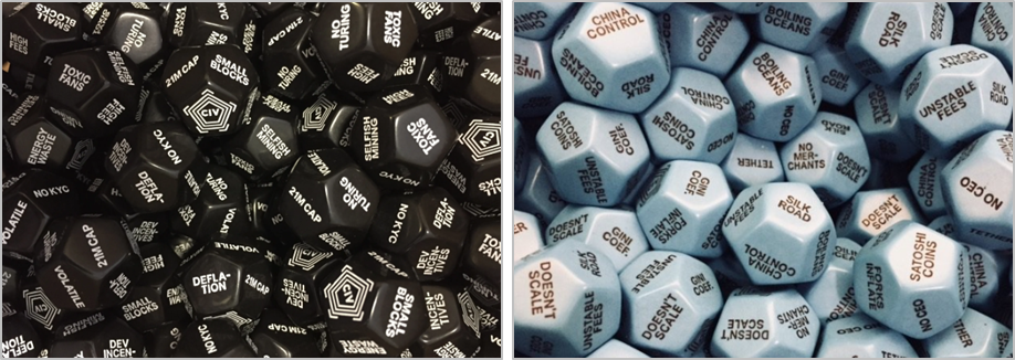 Биткоин FUD (Fear, Uncertainty & Doubt — Страх, Неопределенность и Сомнение) кости версии 1 и 2, предоставленные Ником Картером.