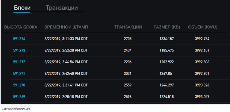 Напомню, что блоки в сети Биткоин создаются в среднем каждые 10 минут; однако, не строго по фиксированному графику каждые 10 минут. Следующий блок может быть решен за 1 минуту или 20 минут, 30 секунд или 36 минут. Сеть сама себя корректирует таким образом, что блоки решаются в среднем каждые 10 минут. Как может торговец или бизнес, обрабатывающий транзакции, существовать в таком медленном и непредсказуемом мире? Биткоин-блоки имеют ограниченное пространство для размещения транзакций. Несмотря на то, что в сети Биткоин нет фиксированной емкости транзакции, каждая Биткоин-транзакция занимает определенное количество места в блоке; в зависимости от емкости блоки включают в среднем приблизительно 2700 транзакций. С десятиминутными средними интервалами между блоками, шесть блоков в час, 24 часа в сутки, 365 дней в году, что соответствует пропускной способности сети около 145 миллионов транзакций в год, что эквивалентно примерно 4,6 транзакциям в секунду. Visa, в свою очередь, обрабатывает 124 миллиарда транзакций в год со скоростью ~ 4000 транзакций в секунду (см. здесь).